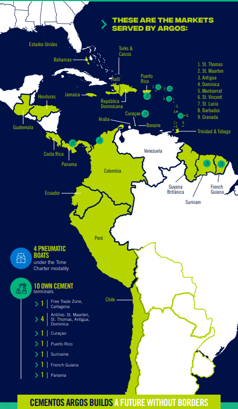 Dans le secteur du ciment, Argos est leader en Colombie, le cinquième plus grand producteur d’Amérique latine et le deuxième plus grand du sud-est des États-Unis. La société possède neuf usines en Colombie, trois aux États-Unis et une au Honduras; dix broyeurs de clinker en Colombie, aux États-Unis, à Haïti, au Panama, en République dominicaine, au Honduras, en Guyane française et au Suriname ; et vingt-quatre ports et terminaux de réception et conditionnement. La capacité totale installée est de 21 millions de tonnes de ciment par an.